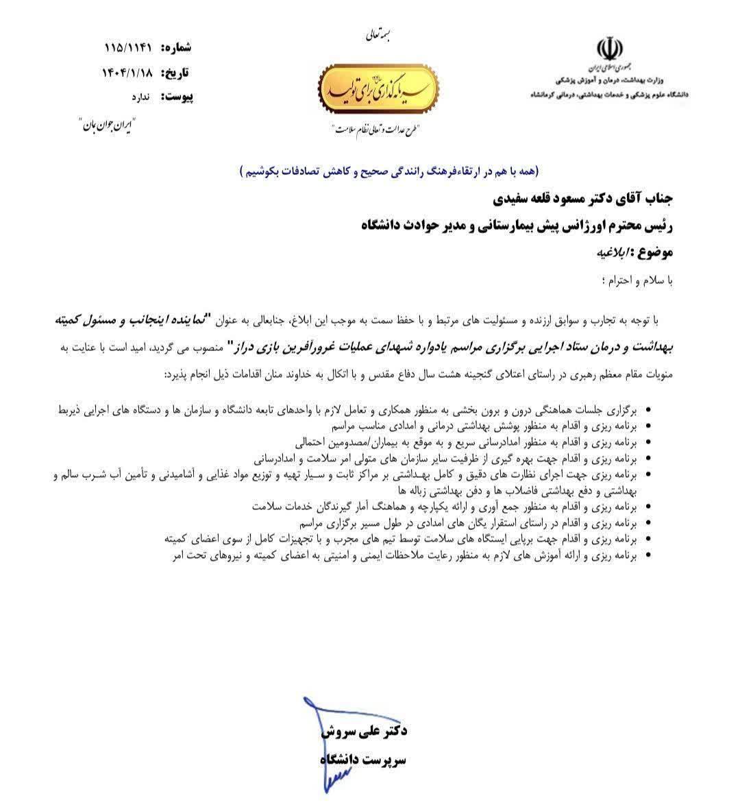 در حکمی از سوی دکتر سروش سرپرست دانشگاه علومپزشکی کرمانشاه، دکتر قلعه سفیدی رئیس اورژانس پیش بیمارستانی و مدیریت حوادث دانشگاه به عنوان نماینده سرپرست دانشگاه و مسئول کمیته بهداشت و درمان ستاد اجرایی مراسم یادواره شهدای عملیات غرورآفرین بازی دراز منصوب شد.