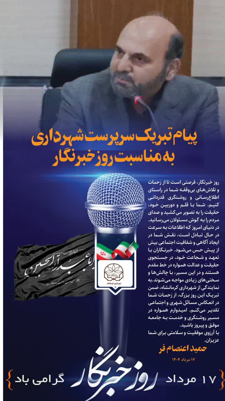 به نمایندگی از شهرداری کرمانشاه، ضمن تبریک این روز بزرگ، از زحمات شما در انعکاس مسائل شهری و اجتماعی تقدیر میکنم. امیدوارم همواره در مسیر روشنگری و خدمت به جامعه موفق و پیروز باشید.
