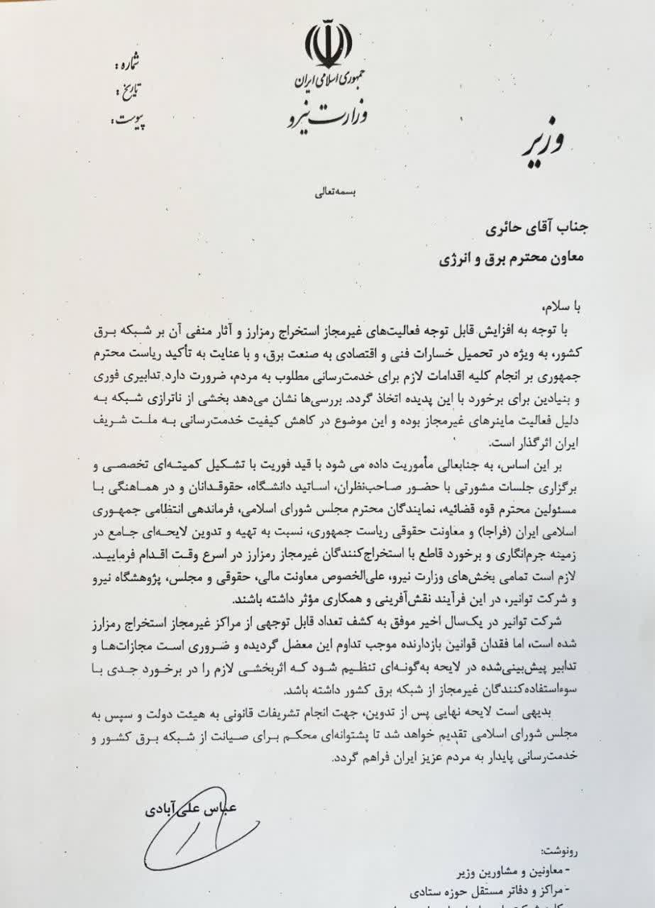 📌 *دستور فوری وزیر نیرو برای تدوین لایحه جرمانگاری استخراج غیرقانونی رمزارز صادر شد