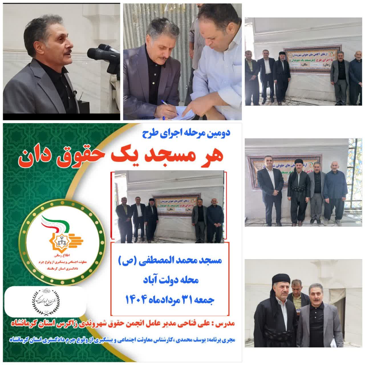 دومین مرحله از طرح «هر مسجد یک حقوقدان» همزمان با سالروز رحلت پیامبر اسلام (ص) و امام حسن مجتبی علیه السلام وبا همکاری نهادهای مردمی در مسجد محمد المصطفی (ص)محله ی دولت آباد کرمانشاه برگزار شد.